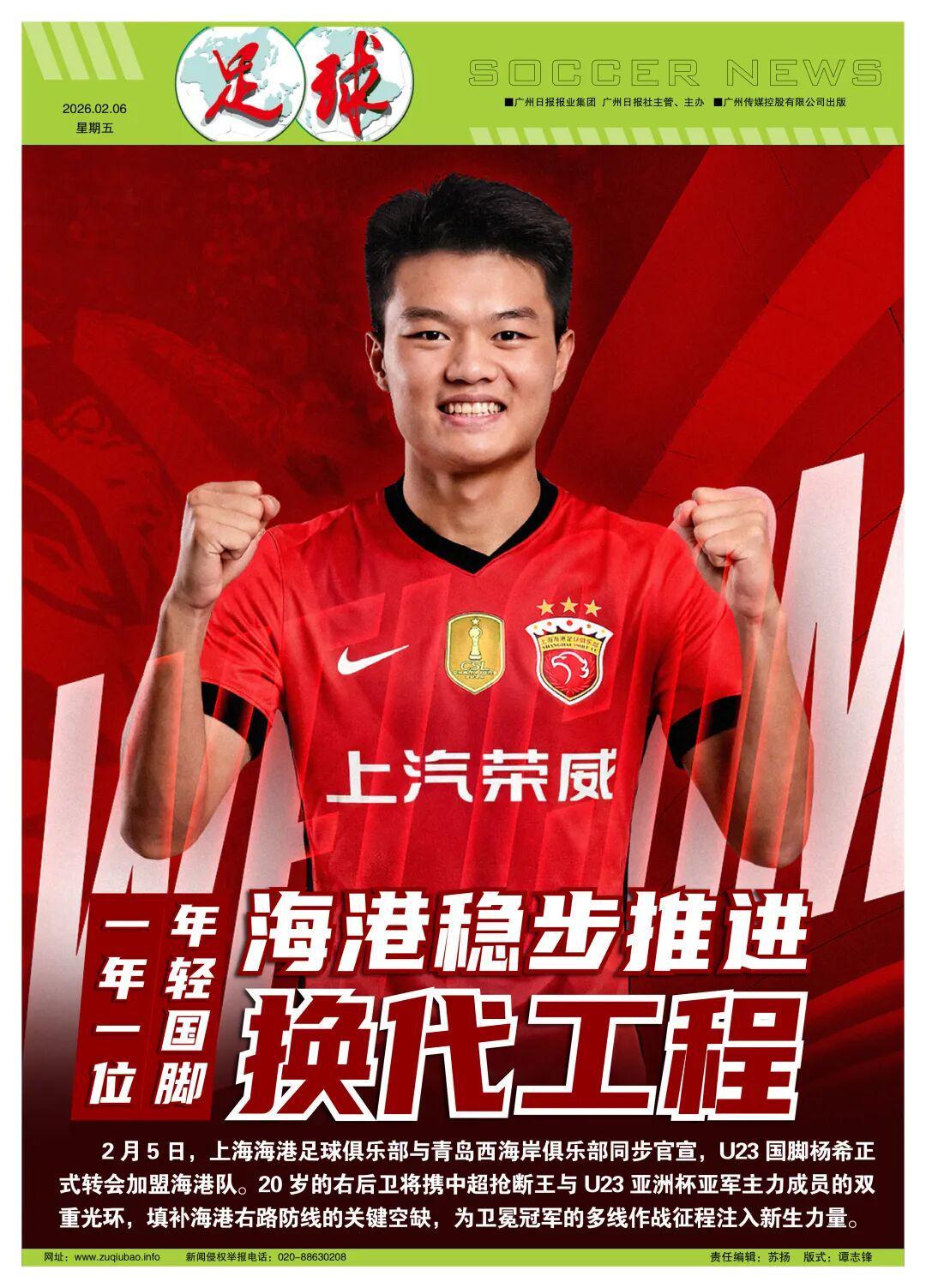 记者程善报道2月5日,上海海港足球俱乐部与青岛西海岸俱乐部同步官宣,U23国脚杨希正式转会加盟海港队。这笔转会费相当于本赛季中超冬窗本土标王级别的交易,历经多方博弈最终尘埃落定。继21岁的吾米提江逐步成长为球队主力并展现出足以跻身国家队的能力之后,20岁的国家队未来右闸希望将携中超抢断王与U23亚洲杯亚军主力成员的双重光环,填补海港右路防线的关键空缺,为卫冕冠军的多线作战征程注入新生力量。