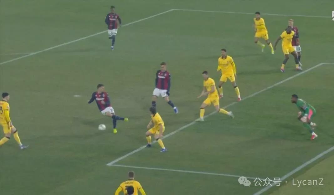 10′10″,博洛尼亚逼抢前场完成断球,直接形成4V4面对米兰后卫,在弧顶机会和下底选择中,罗维选择自己单干,突入禁区也晃开了加比亚重心,受到推搡但没有吹罚。